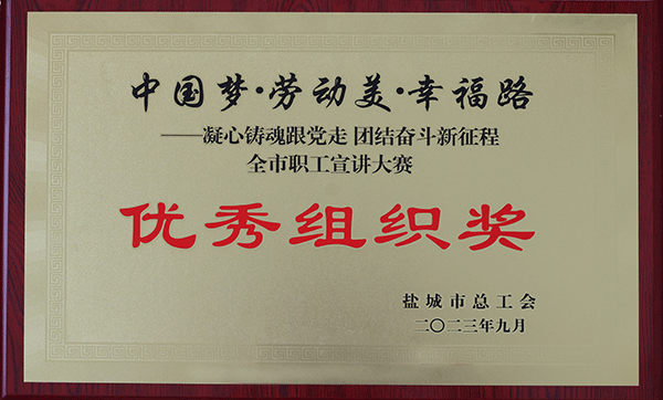 為深入學(xué)習(xí)貫徹習(xí)近平新時(shí)代中國特色社會主義思想和黨的二十大精神。市總工會開展了“強(qiáng)國復(fù)興有我”群眾性宣傳教育活動。9月20日,“中國夢·勞動美·幸福路——凝心鑄魂跟黨走 團(tuán)結(jié)奮斗新征程”全市職工宣講比賽決賽在射陽縣工人文化宮舉行,海興集團(tuán)獲“優(yōu)秀組織獎”,工會職工姜晏獲優(yōu)秀獎。2023-09-22 -